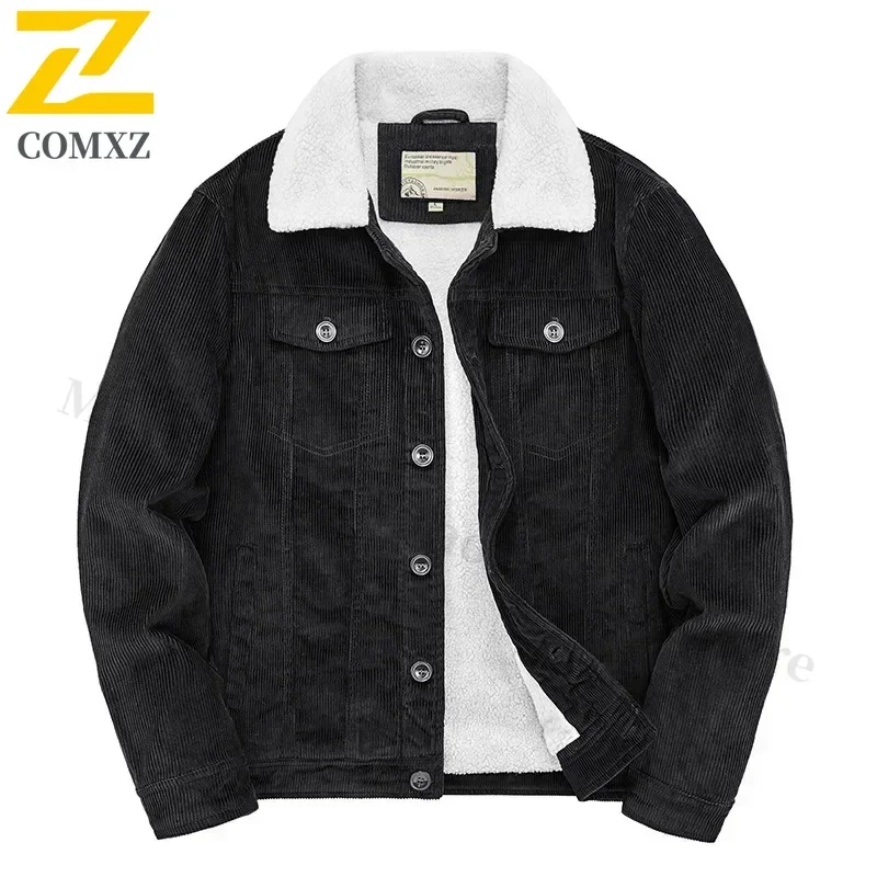 Male Cotton Jackets Padded Warm Loose Parka Coat Corduroy Short Jacket Man Solid Fur Collar Windbreaker Winter Men Fleece Jacket – Black, XXXL